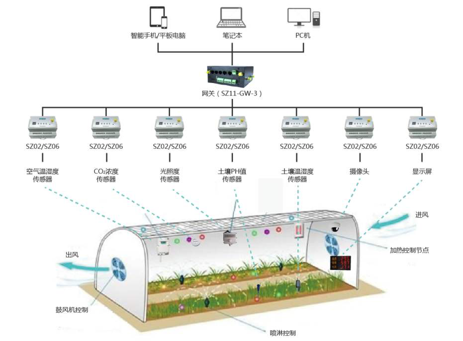 以生態(tài)溫室為例,隨著遠程監(jiān)控系統(tǒng)、無線傳感器監(jiān)測等技術日趨成熟,物聯(lián)網(wǎng)、大數(shù)據(jù)等技術已逐步應用到了生態(tài)農(nóng)業(yè)建設中。通過環(huán)境、動植物信息檢測,溫室農(nóng)業(yè)大棚信息檢測和標準化生產(chǎn)監(jiān)控,精準農(nóng)業(yè)中的節(jié)水灌溉等應用模式,提高了農(nóng)業(yè)生產(chǎn)的管理效率、提升了農(nóng)產(chǎn)品的附加值、加快了智慧農(nóng)業(yè)的建設步伐。其主要方式通過安裝于指定的監(jiān)測點的空氣溫濕度傳感器、土壤溫濕度傳感器、土壤PH傳感器、光合有效輻射傳感器、CO2傳感器等設備實時監(jiān)測空氣的溫濕度、二氧化碳濃度、土壤溫濕度及PH值等相關數(shù)據(jù);聯(lián)動控制系統(tǒng)由加熱、噴灌、通風、卷簾設備及其配套PLC及Wifi設備服務器組成,當傳感器采集的環(huán)境數(shù)據(jù)與標準值對比超出臨界范圍時,控制器自動啟動相關硬件設備對作物生長環(huán)境加熱、澆水、通風、卷簾加減光照輻射,實現(xiàn)作物生長過程精確控制。同時在塑膜日光溫室旁,建立地下沼氣池,沼氣池上方建圈舍及廁所,形成一個封閉的智慧化能源生態(tài)系統(tǒng)。在此系統(tǒng)內(nèi),圈舍溫度在冬天提高3~5℃,為禽畜提供了更適宜的生長條件,使豬的生長期大幅縮短約150天。禽畜糞便為沼氣池提供原料,產(chǎn)出的沼氣用于家庭供暖,殘留的沼渣、沼液作為溫室作物的肥料。此外,豬等禽畜呼吸排出的CO2可促進溫室內(nèi)作物光合作用,蔬菜產(chǎn)量和質(zhì)量明顯提高。