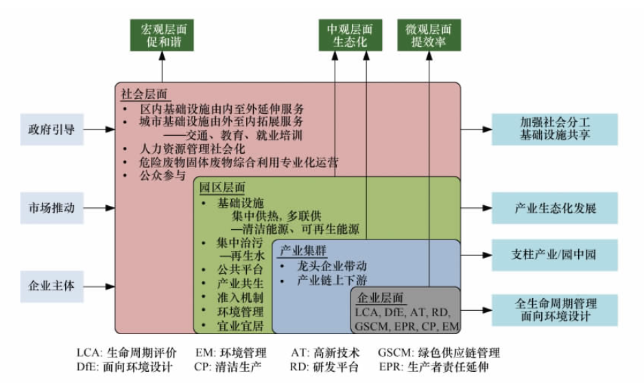 我國實施可持續(xù)發(fā)展戰(zhàn)略要求發(fā)展生態(tài)工業(yè),打破“綠色壁壘”也需要工業(yè)的生態(tài)化發(fā)展,可以說,生態(tài)工業(yè)是我國工業(yè)發(fā)展的必然選擇。生態(tài)工業(yè)理念被引入中國后,原國家環(huán)保總局于2000年開始推動生態(tài)工業(yè)園區(qū)建設,發(fā)展過程中逐步形成了“有標準可依,依標準建設,據(jù)標準考核,示范試點帶動,建立長效機制”的發(fā)展路線圖。鑒于開發(fā)區(qū)面臨的嚴峻環(huán)境保護形勢,國家稅收政策調(diào)整、資源和能源緊缺、環(huán)保標準提高等伴隨的發(fā)展壓力,以及節(jié)能減排科技需求,2007年環(huán)保部、商務部、科技部聯(lián)合,加強對國家生態(tài)工業(yè)示范園區(qū)建設的推進。生態(tài)工業(yè)示范園區(qū)是依據(jù)清潔生產(chǎn)要求、循環(huán)經(jīng)濟理念和工業(yè)生態(tài)學原理而設計建立的一種新型工業(yè)園區(qū)。它通過物流或能流傳遞等方式把不同工廠或企業(yè)連接起來,形成共享資源和互換副產(chǎn)品的產(chǎn)業(yè)共生組合,使一家工廠的廢棄物或副產(chǎn)品成為另一家工廠的原料或能源,模擬自然系統(tǒng),在產(chǎn)業(yè)系統(tǒng)中建立“生產(chǎn)者—消費者—分解者”的循環(huán)途徑,尋求物質(zhì)閉環(huán)循環(huán)、能量多級利用和廢物產(chǎn)生最小化。