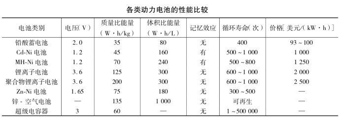 各類動(dòng)力電池的性能比較見(jiàn)下表: