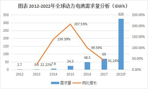 2017年全球應(yīng)用于電動(dòng)汽車動(dòng)力電源規(guī)模為69.0GWh,是消費(fèi)電子、動(dòng)力、儲(chǔ)能三大板塊中增量最大的板塊。GGII預(yù)計(jì)到2022年全球電動(dòng)汽車鋰電池需求量將超過(guò)325GWh,相比2017年增長(zhǎng)3.7倍。