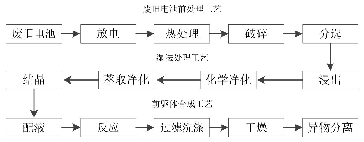 公司應(yīng)用電池回收技術(shù)生產(chǎn)鋰電池材料,主要產(chǎn)品是三元前驅(qū)體,其生產(chǎn)流程分為廢舊電池前處理工藝、濕法處理工藝以及前驅(qū)體合成工藝三階段,具體過(guò)程為: