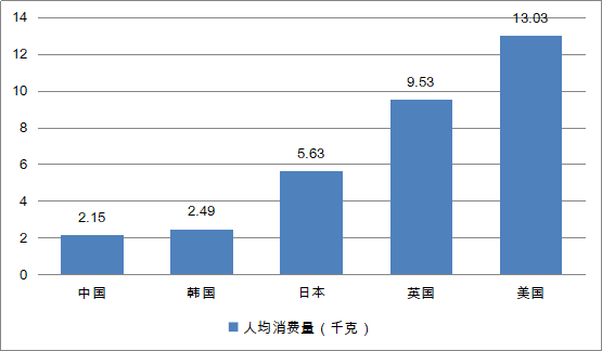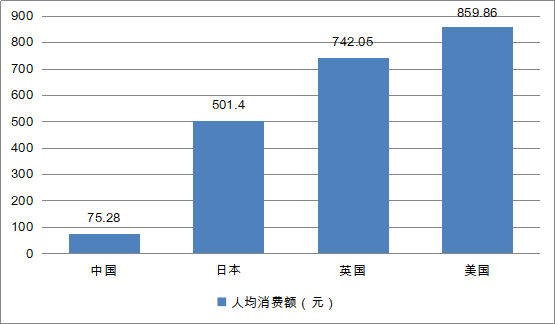 從消費(fèi)額來看,中國休閑食品人均消費(fèi)額為75.28元,而日本、英國、美國的該數(shù)額分別是501.4元,742.05元和859.86元,差距較大。