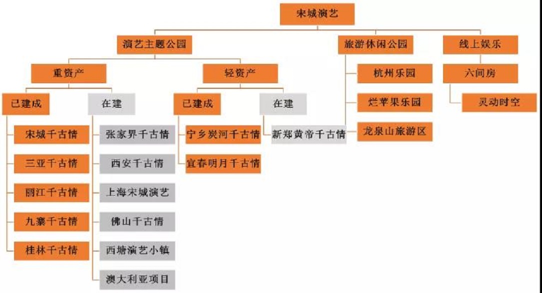 宋城演藝是國內最大的演藝主題公園,主營業(yè)務為主題公園和文化演藝的投資、開發(fā)、經營。以“演藝”為核心競爭力,成功打造了“宋城”和“千古情”品牌,產業(yè)鏈覆蓋旅游休閑、現場娛樂、互聯網娛樂,是世界大型的線上和線下演藝企業(yè)。宋城演藝旗下擁有35個各類型劇院、75000個座位數,超過世界兩大戲劇中心倫敦西區(qū)全部劇院、美國百老匯全部劇院的座位總數。采用輕重資產相結合的復制形式,公司已建成和在建杭州、三亞、麗江、九寨、桂林、張家界、西安、上海、龍泉山、澳大利亞等數十大旅游區(qū)。