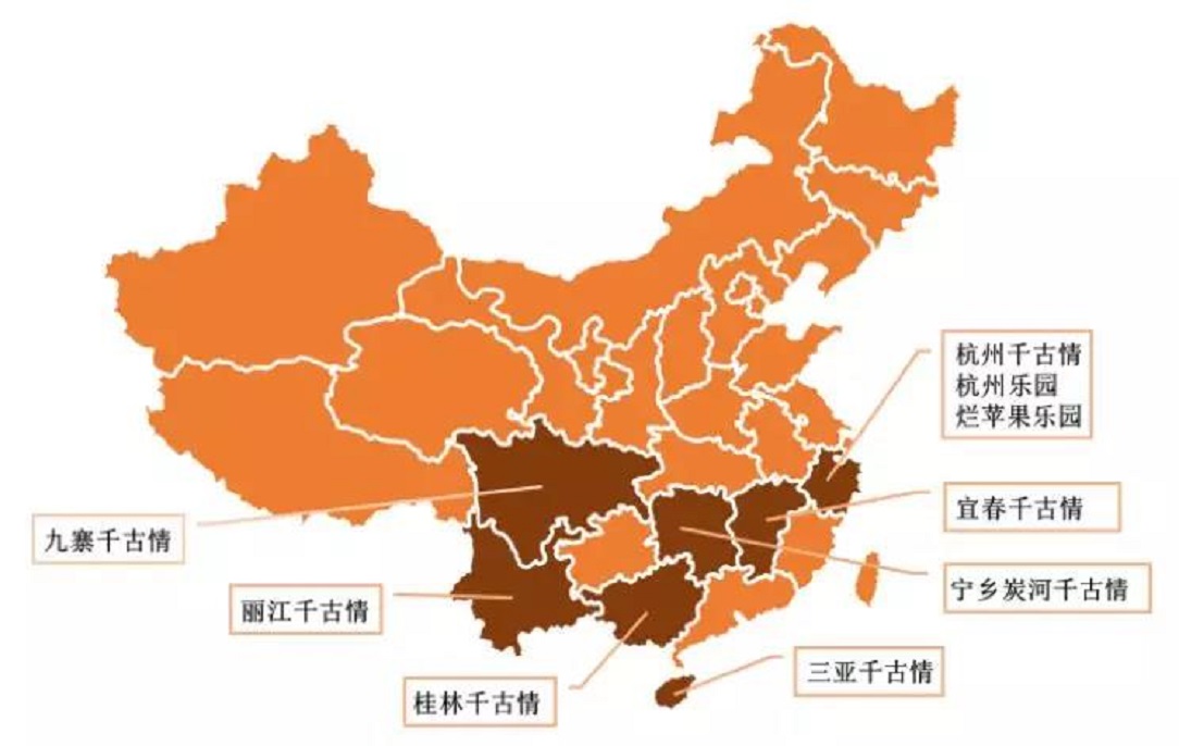 宋城演藝的主題公園主要布局在旅游發(fā)達城市和地區(qū),目前有9個主題公園,包括7個千古情景區(qū),布局城市包括一線旅游城市杭州、三亞、麗江、九寨、桂林,也在二三線旅游城市如寧鄉(xiāng)、宜春進行輕資產布局。