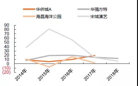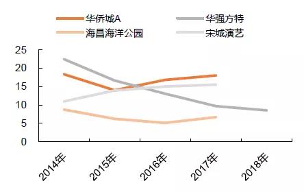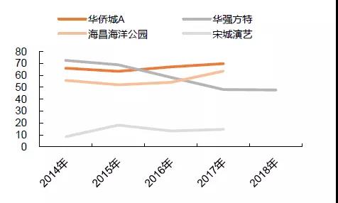 華僑城和海昌海洋公園均有地產開發(fā)業(yè)務,其中華僑城以房地產收入為主,2018年上半年旅游業(yè)務收入占比32%;海昌海洋公園地產收入占比很低,且近年來聚焦主題公園業(yè)務,地產收入占比明顯下降,從2010年的52%降低到2018年上半年的7%,主題公園營運收入占比達93%。