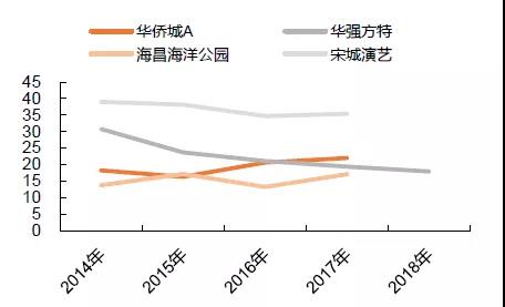 宋城演藝凈利潤規(guī)模僅次于華僑城,2014-2016年由于異地復制的新項目開業(yè),以及收購六間房,營收和凈利潤增速遠高于其他主題公園集團。宋城演藝的主題公園建設所需投入較低,每個主題公園大約只需5-10億元,遠低于其他主題公園幾十億甚至上百億的投入,因此資產負債率很低,不到20%。宋城演藝主題公園盈利能力較強,ROE16%左右,高于行業(yè)平均水平,且保持穩(wěn)步提升。