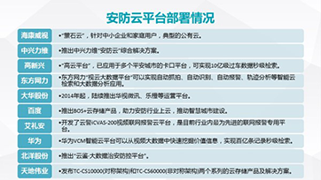 當(dāng)前平安城市和智慧城市的建設(shè)中,智能化分析已經(jīng)得以大量應(yīng)用,大量實(shí)例證明智能化分析在城市視頻監(jiān)控中的必要性。但目前安防,智能化不足是安防行業(yè)的主要頑疾之一,更加智能化將是未來發(fā)展方向和創(chuàng)新點(diǎn)。 另一方面,平安城市和智慧城市建設(shè)的重心已經(jīng)從前端的攝像頭等硬件設(shè)備向后端聯(lián)網(wǎng)平臺(tái)系統(tǒng)轉(zhuǎn)移。未來云平臺(tái)將成為安防企業(yè)競爭的核心。多家企業(yè)已開始布局安放云平臺(tái)通過云平臺(tái)可以引申出一系列配套的產(chǎn)品、服務(wù)和解決方案,未來平臺(tái)建設(shè)能力較強(qiáng)的廠商可通過將平臺(tái)免費(fèi)提供給用戶使用,而由于平臺(tái)轉(zhuǎn)換成本高,這將大大增加用戶的使用粘性。