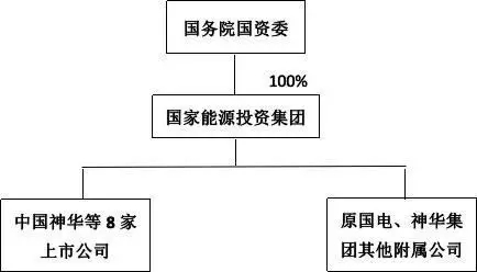 在神華集團(tuán)與國電集團(tuán)吸收合并前,國務(wù)院國資委分別持有國電集團(tuán)、神華集團(tuán)100%股權(quán)。吸收合并完成之后,國務(wù)院國資委持有國家能源投資集團(tuán)100%股權(quán)。如圖所示: