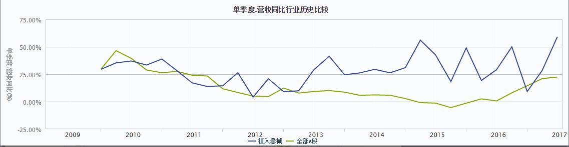 根據(jù)與全部A股營收相比較,在2012年之前,植入器械的營收總體上與全部A股的保持一致。2012年之后,全部A股的營收變動(dòng)相對(duì)平緩;而植入器械行業(yè)營收基本高于全部A股營收,在2016年經(jīng)歷谷值之后,行業(yè)保持增長的趨勢(shì)。