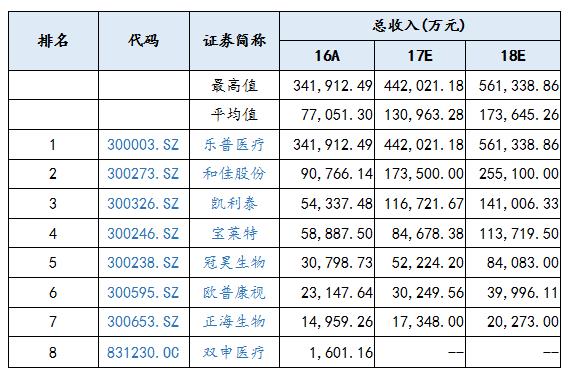 通過對(duì)植入器械上市公司的盈利做出預(yù)測,上市公司總收入的平均值在2017年、2018年預(yù)計(jì)分別是130,963.28萬元、173,645.26萬元,相對(duì)于2016年的77,051.30萬元,呈現(xiàn)逐年增長的趨勢(shì);其上市公司盈利最高值預(yù)測值在2017年、2018年分別達(dá)到442,021.18萬元、561,338.86,相較于2016年的341,912.49萬元,呈現(xiàn)逐年增長的趨勢(shì),市場總體看好植入器械上市公司。