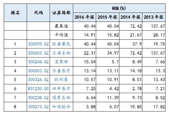 根據(jù)植入器械行業(yè)上市公司年報(bào)數(shù)據(jù)顯示,上市公司凈資產(chǎn)收益率平均值在2013年至2016年分別為28.17%、21.67%、15.82%、14.91%,凈資產(chǎn)收益率最高值在2013年至2016年分別為137.67%、72.42%、40.04%、40.44%。