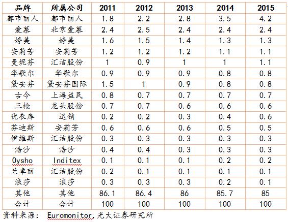 內(nèi)衣作為消費(fèi)者的第二層“肌膚”,消費(fèi)者對內(nèi)衣的消費(fèi)比其他成衣具備更強(qiáng)的忠誠度,進(jìn)入 21 世紀(jì)后,消費(fèi)者對內(nèi)衣品牌的認(rèn)可也越來越強(qiáng)。 雖然部分品牌由于品牌老化導(dǎo)致市占率降低,但是總體看,前 16 家女士內(nèi)衣品牌的市場份額從 2011 年的 13.9%提升到了 2015 年的 15%。前八大男士內(nèi)衣品牌的市占率從 5.4%提升到 6%。