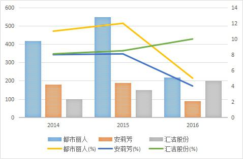 都市麗人發(fā)布的2016年業(yè)績報(bào)告顯示,公司實(shí)現(xiàn)收入45.12億元人民幣,同比下跌8.9%。股東應(yīng)占利潤2.41億元,同比下跌55.2%。