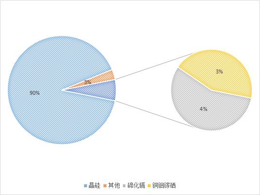 晶硅太陽能電池約占市場(chǎng)份額90%;薄膜太陽能電池占市場(chǎng)份額約10%,其中碲化鎘市場(chǎng)份額約4%,銅銦鎵硒約占市場(chǎng)份額3%。其他薄膜電池如軍工領(lǐng)域應(yīng)用較多的砷化鎵、目前無法規(guī)?;拟}鈦礦等太陽能電池占市場(chǎng)份額約3%。碲化鎘目前90%的市場(chǎng)由美國(guó)薄膜電池制造商First Solar壟斷。