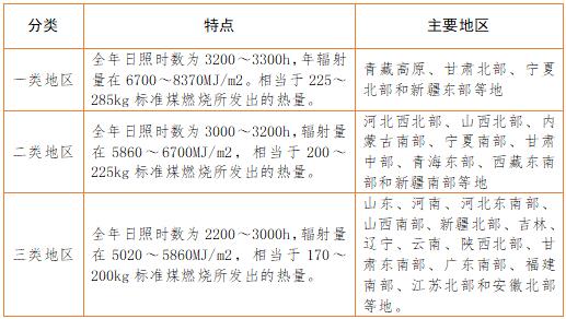 太陽能資源的分布與各地的緯度、海拔高度、自然地理狀況和氣候條件有關(guān)。我國(guó)屬太陽能資源豐富的國(guó)家之一,全國(guó)總面積2/3以上地區(qū)年日照時(shí)數(shù)大于2000h,根據(jù)中國(guó)氣象局風(fēng)能太陽能評(píng)估中心推薦的國(guó)內(nèi)太陽能資源地區(qū)分類辦法,共分5類,其中: