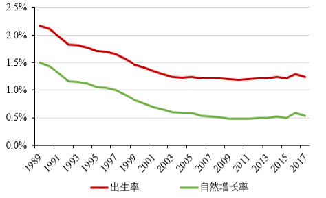 另一方面,中國(guó)近年來的人口出生率和自然增長(zhǎng)率也呈現(xiàn)不斷下降的趨勢(shì),2017年比2016年出生人口減少了63萬人,人口出生率僅為12.4‰,同比降低0.5‰,這一數(shù)據(jù)比日本的出生率還要低。我國(guó)的人口自然增長(zhǎng)率更是下降到5.3‰,長(zhǎng)期的低生育水平直接加大了對(duì)未來我國(guó)勞動(dòng)力不足的擔(dān)憂。