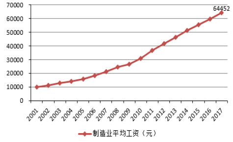 除了未來勞動(dòng)力不足之外,中國(guó)制造業(yè)員工的平均工資則呈現(xiàn)逐年增長(zhǎng)的態(tài)勢(shì),2017年已升至64452元,同比增長(zhǎng)8.4%。勞動(dòng)力成本不斷上升,用機(jī)器人代替人工也是更加經(jīng)濟(jì)、符合市場(chǎng)規(guī)律的必然選擇。目前,“世界工廠”正不斷的從中國(guó)向東南亞等其他國(guó)家和地區(qū)轉(zhuǎn)移,中國(guó)改革開放初期借助人口紅利快速發(fā)展的條件已然不復(fù)存在。解決勞動(dòng)力不足、勞動(dòng)力成本上升的主要途徑就是智能制造,即生產(chǎn)過程的自動(dòng)化、智能化產(chǎn)業(yè)升級(jí)。未來通過產(chǎn)業(yè)的轉(zhuǎn)型升級(jí)更加注重質(zhì)量和效益的提升,“機(jī)器代人”的生產(chǎn)方式將會(huì)更加普遍。