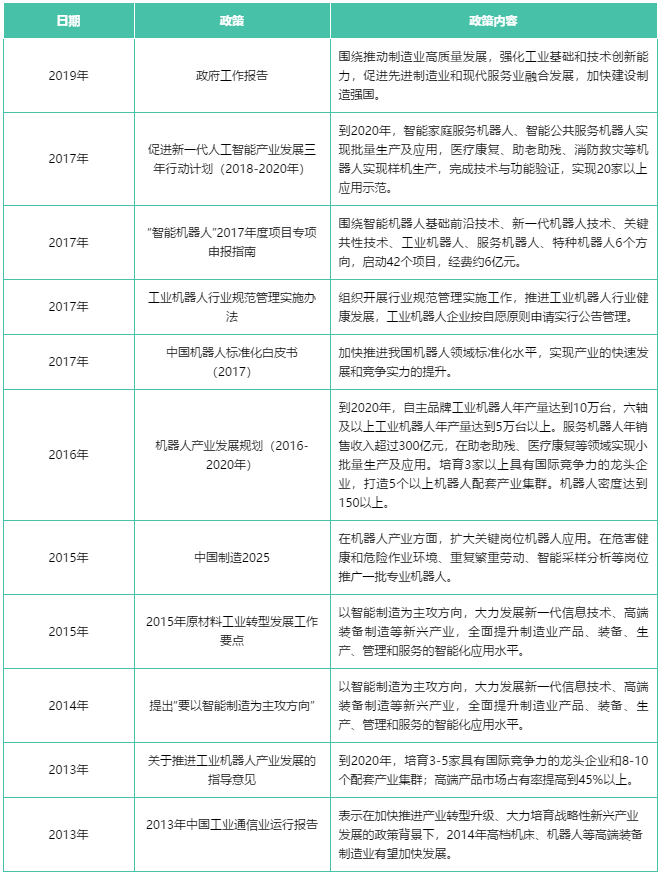 智能制造是“中國(guó)制造2025”發(fā)展規(guī)劃的重要發(fā)展方向,是未來制造業(yè)發(fā)展的必然趨勢(shì),工業(yè)機(jī)器人是智能制造的關(guān)鍵設(shè)備,行業(yè)發(fā)展?jié)摿薮?。近年來,?guó)家出臺(tái)了一系列的政策支持和鼓勵(lì)中國(guó)工業(yè)機(jī)器人行業(yè)的發(fā)展。根據(jù)2016年國(guó)務(wù)院發(fā)布的《機(jī)器人產(chǎn)業(yè)發(fā)展規(guī)劃(2016-2020年)》,到2020年,我國(guó)工業(yè)機(jī)器人產(chǎn)量達(dá)到10萬臺(tái),六軸及以上工業(yè)機(jī)器人年產(chǎn)量達(dá)到5萬臺(tái)以上;培育3家以上具有國(guó)際競(jìng)爭(zhēng)力的龍頭企業(yè);機(jī)器人密度達(dá)到150以上。