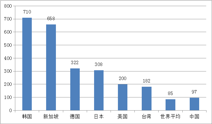 2017年全球主要市場(chǎng)工業(yè)機(jī)器人密度對(duì)比(臺(tái)/萬人)