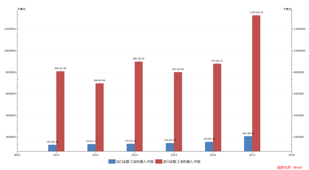 中國(guó)工業(yè)機(jī)器人進(jìn)出口金額(萬美元)