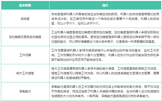 工業(yè)機(jī)器人的主要技術(shù)參數(shù)一般有自由度、定位精度及重復(fù)定位精度、工作范圍、最大工作速度和承載能力等。這些參數(shù)是工業(yè)機(jī)器人本體制造過程中重要的考量指標(biāo),是衡量一家廠商本體制造水平高低的標(biāo)準(zhǔn)。